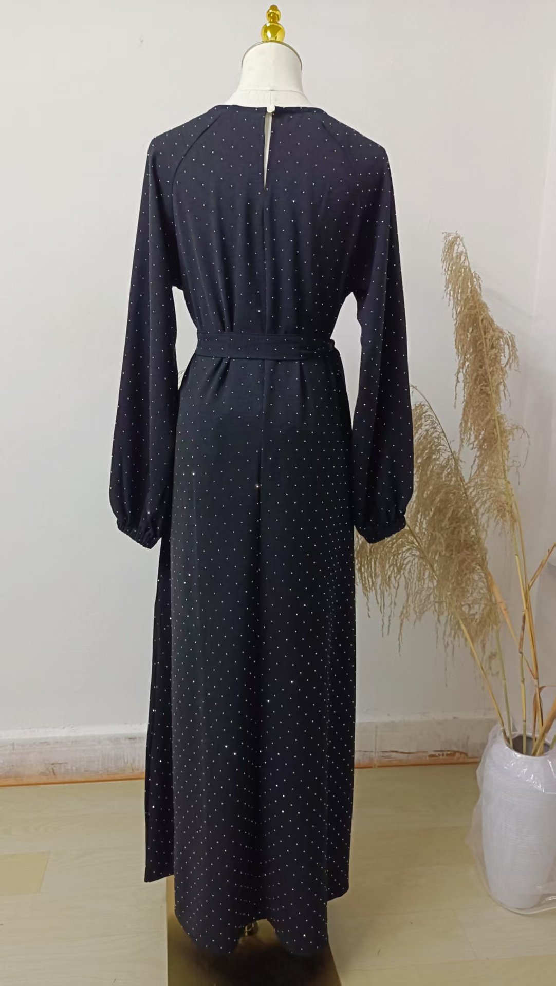 Muslim Rhinestone Dubai Round Neck Pullover Belt Dress